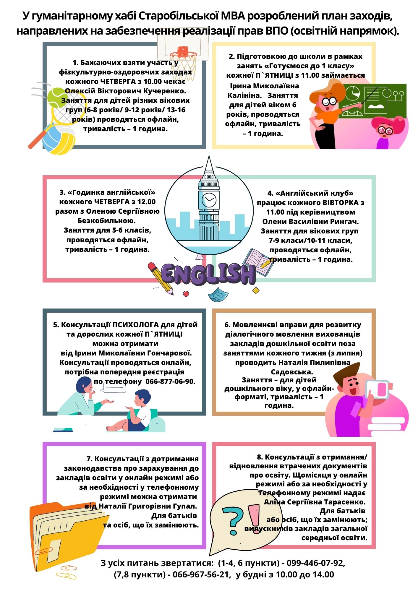 - «Годинка англійської» кожного ЧЕТВЕРГА з 12.00 разом з Оленою Сергіївною Безкобильною. Заняття для 5-6 класів, проводяться офлайн, тривалість – 1 година.