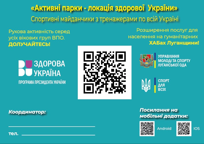 Соціальний проект Президента України і Міністерства молоді та спорту України «АКТИВНІ ПАРКИ - ЛОКАЦІЇ ЗДОРОВОЇ УКРАЇНИ» - розробка навігаційної карти безкоштовних для населення рекреаційних занять в парках та скверах. Основною метою є залучення людей до систематичних тренувальних сесій, спрямованих на розвиток основних рухових якостей - загальна витривалість, сила, спритність, координація, гнучкість, швидкість.