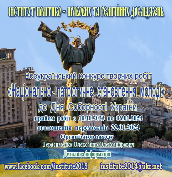 Всеукраїнський конкурс творчих робіт «Національно-патріотичне становлення молоді» з нагоди відзначення Дня Соборності України) проводиться Інститутом політико-правових та релігійних досліджень за підтримки:
