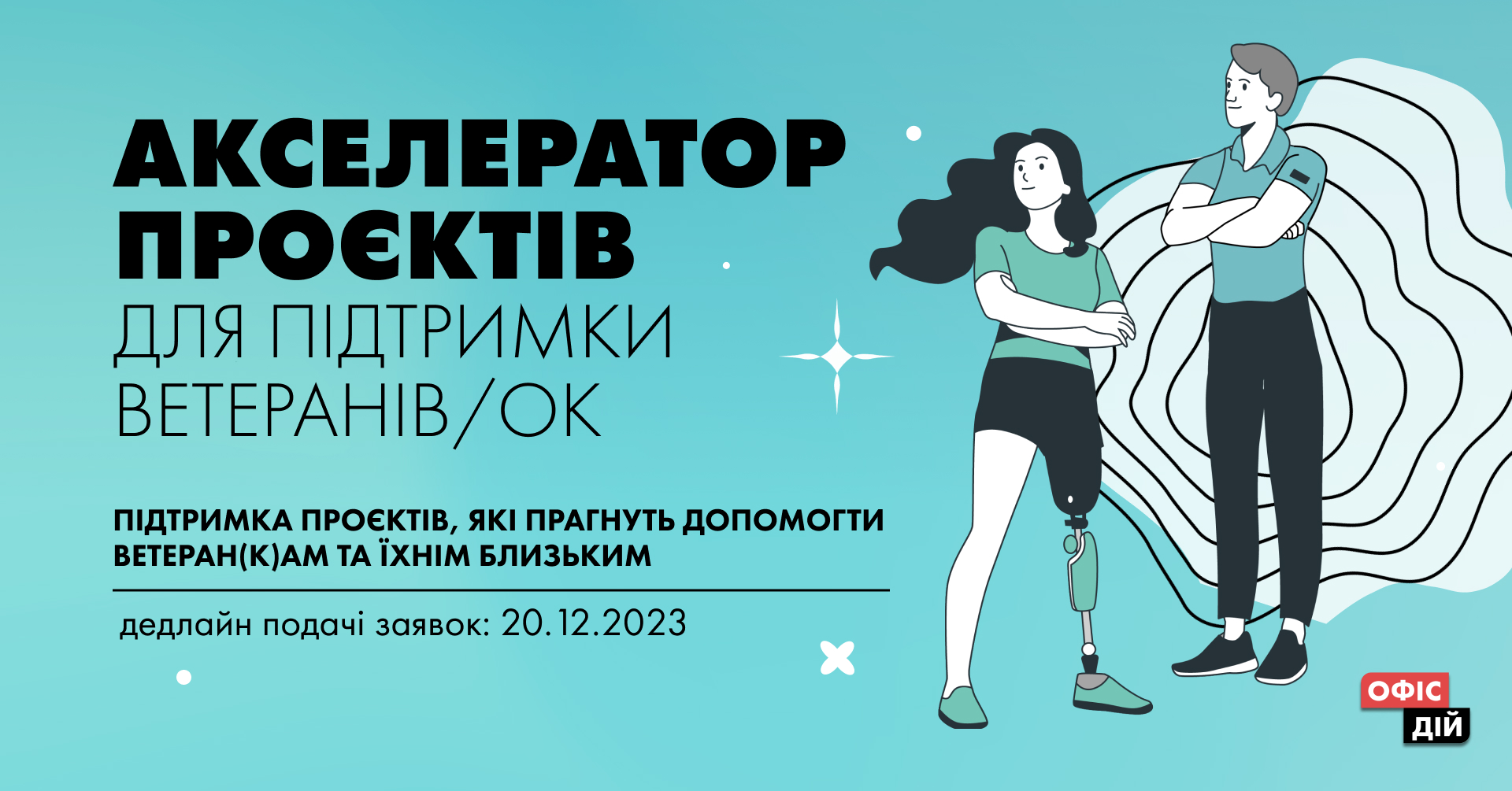 Акселератор проєктів для підтримки ветеранів/ок від Офісу Дій — це програма для 15-ти людей або організацій, які займаються підтримкою ветеранів/ок війни проти росії.