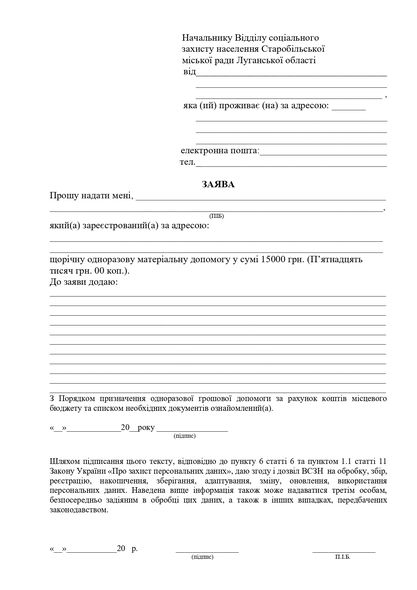 • особисту письмову заяву на ім’я начальника Відділу соціального захисту Старобільської міської ради Луганської області відповідно до зразка (на фото);