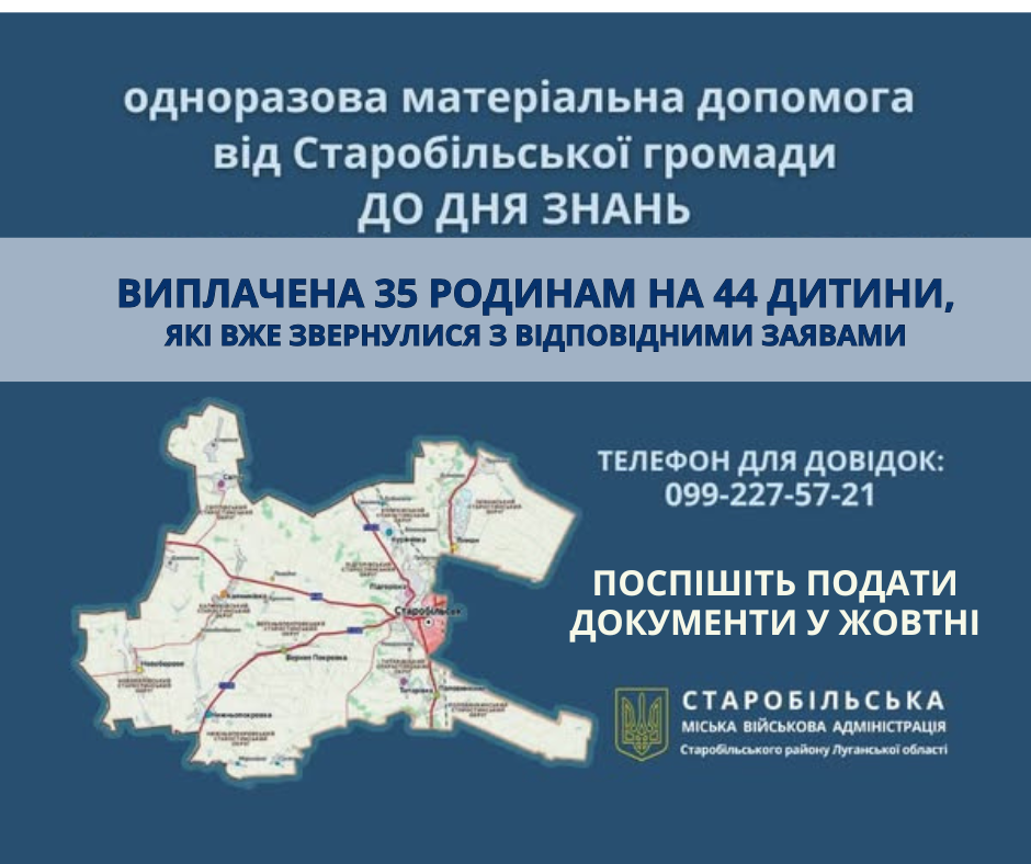 Матеріальну допомогу з нагоди Дня знань від Старобільської громади на початку жовтня вже отримали 35 родин, в яких виховуються 44 дитини, на загальну суму 220 тисяч гривень.