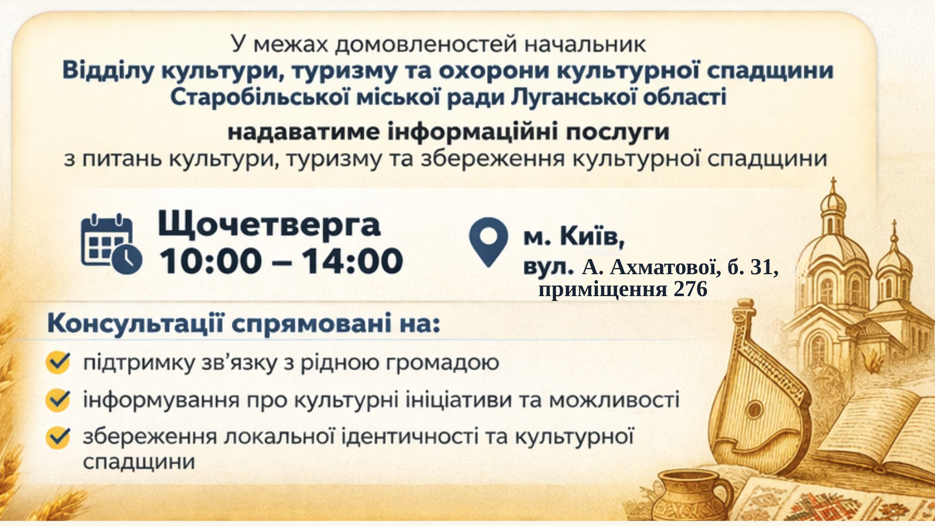 Консультації надає начальник Відділу культури, туризму та охорони культурної спадщини.